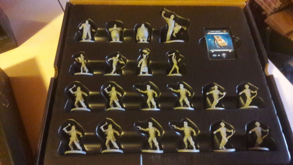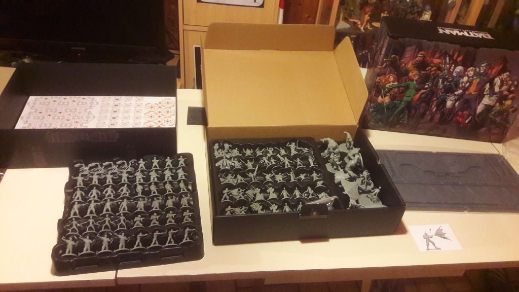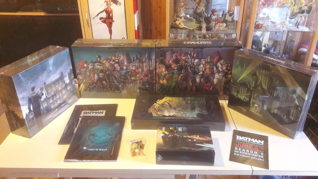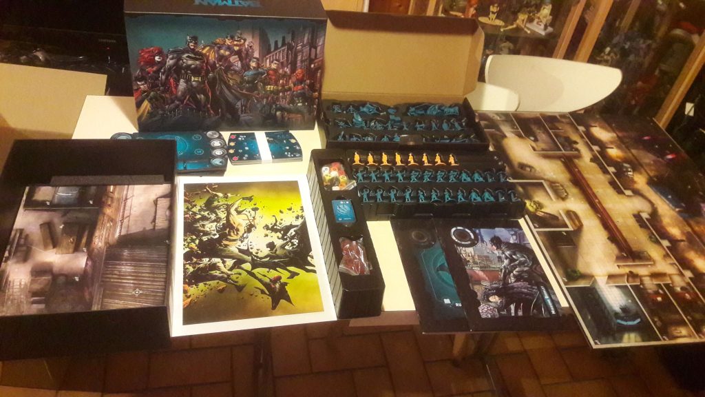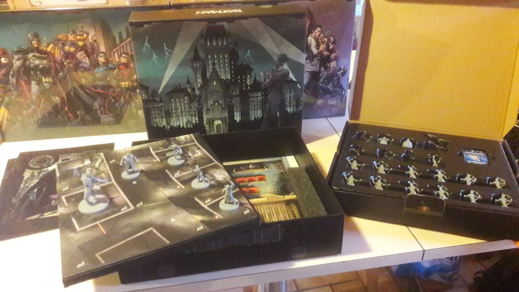 Les deux boîtes de base (le jeu plus les paliers Kickstarter), les deux extensions, la variante 1 vs 1, et la Batmobile.