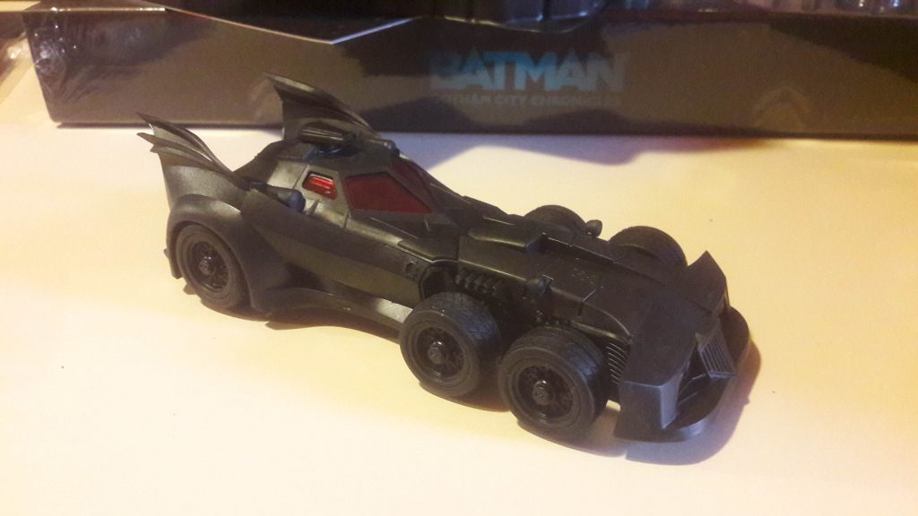 La Batmobile, justifiant sa boite pour elle toute seule, comprend sa figurine ainsi que plaquette et règles uniquement pour elle. On peut noter le pare brise rouge, un effort qui ajoute tout de suite un petit effet, surtout pour moi qui n’ai pas prévu de peindre les figurines. Trop de figurines, trop de boulot…